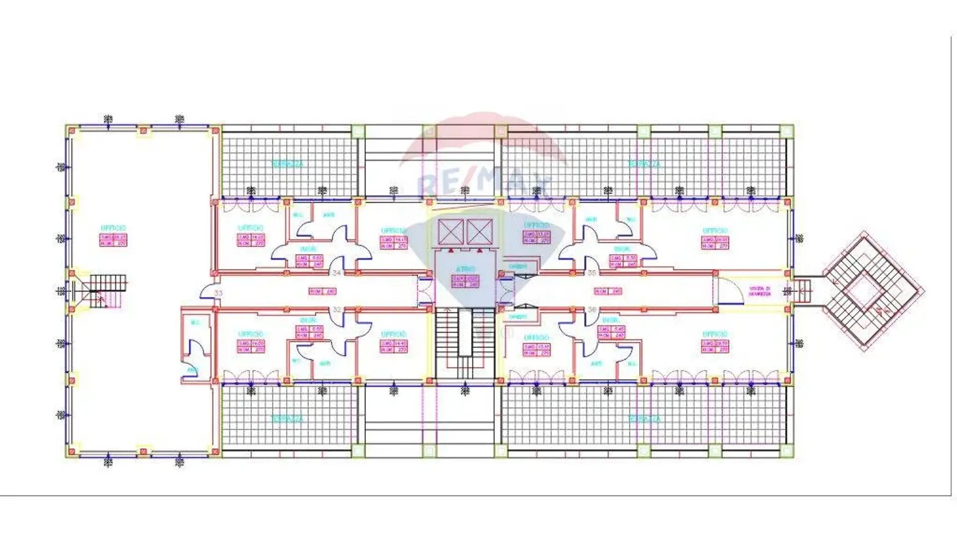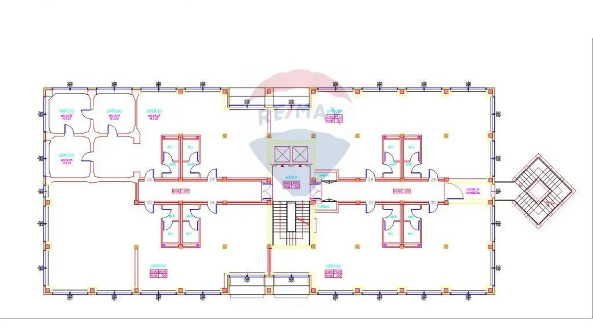 È possibile affittare piani interi (750 mq) o mezzi piani (375 mq).